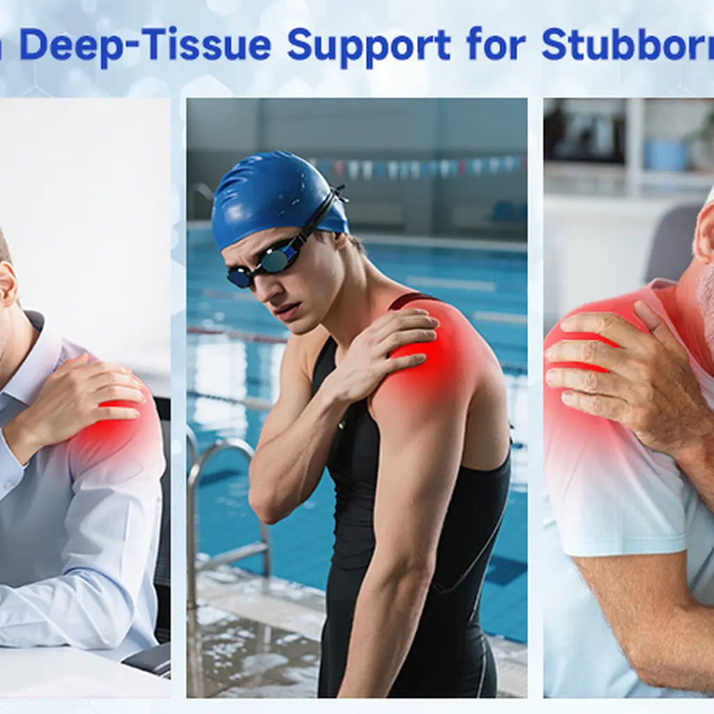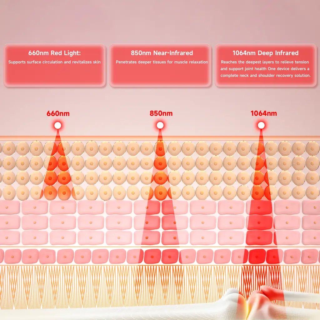 Deep Tissue Relief: Red and near-infrared light penetrates muscles to help ease pain and tension.